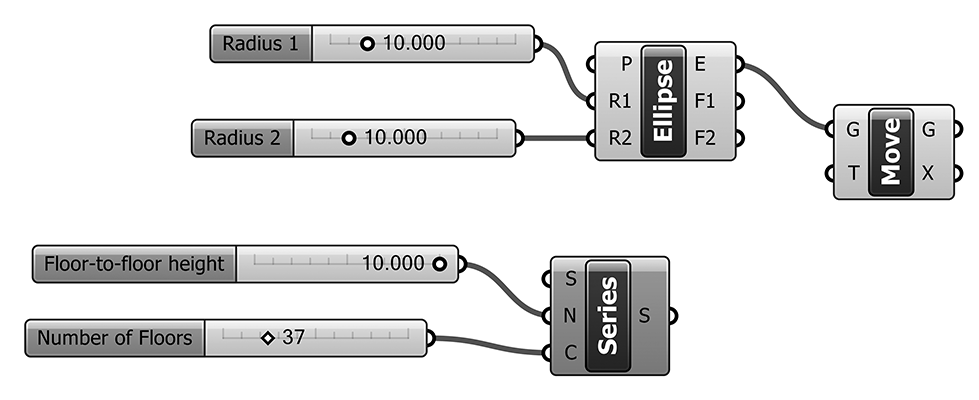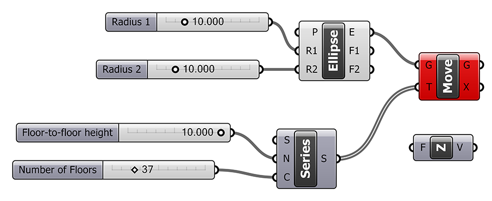 However, we need multiple ellipses, placed at a variable distance (i. e., floor-to-floor height) above the original ellipse. We will need to do something different for the T input on the Move component. Specifically, we will need to provide to this component as input a list of numbers corresponding to the vertical positions of the floors.