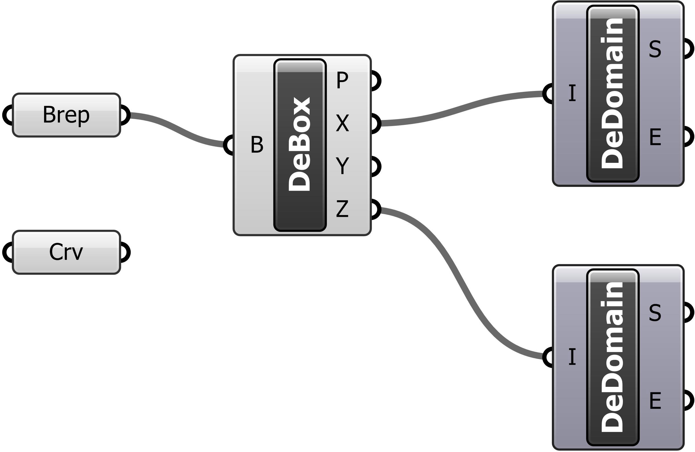 4. Insert two instances of the Deconstruct Domain component. Connect the X output of Deconstruct Box to the input on the first Deconstruct Domain component; connect the Z output of Deconstruct Box to the input on the second Deconstruct Domain component. [Deconstruct Domain extracts the beginning and end points of a domain, in this case the beginning and end points of the X and Z dimensions of the “brick”.]