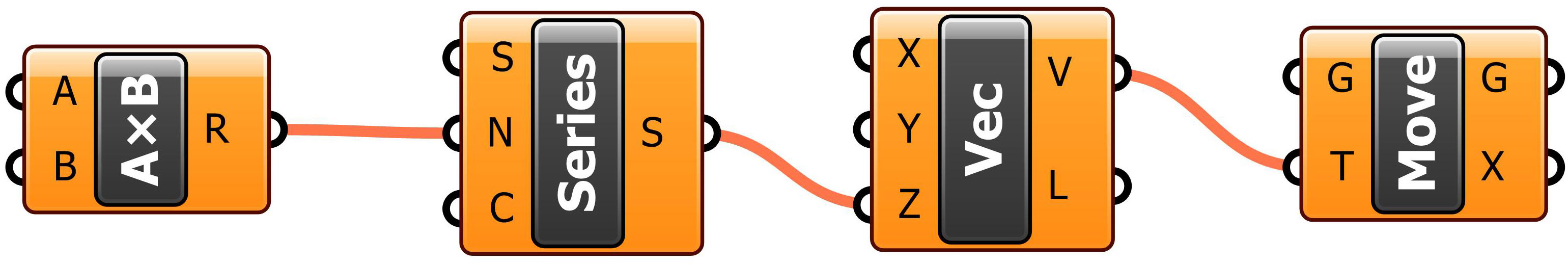 9. Connect the components: Connect the R output of Multiplication to the N input of Series; connect the S output of Series to the Z input of Vector XYZ; connect the V output of Vector XYZ to the T input of Move.
