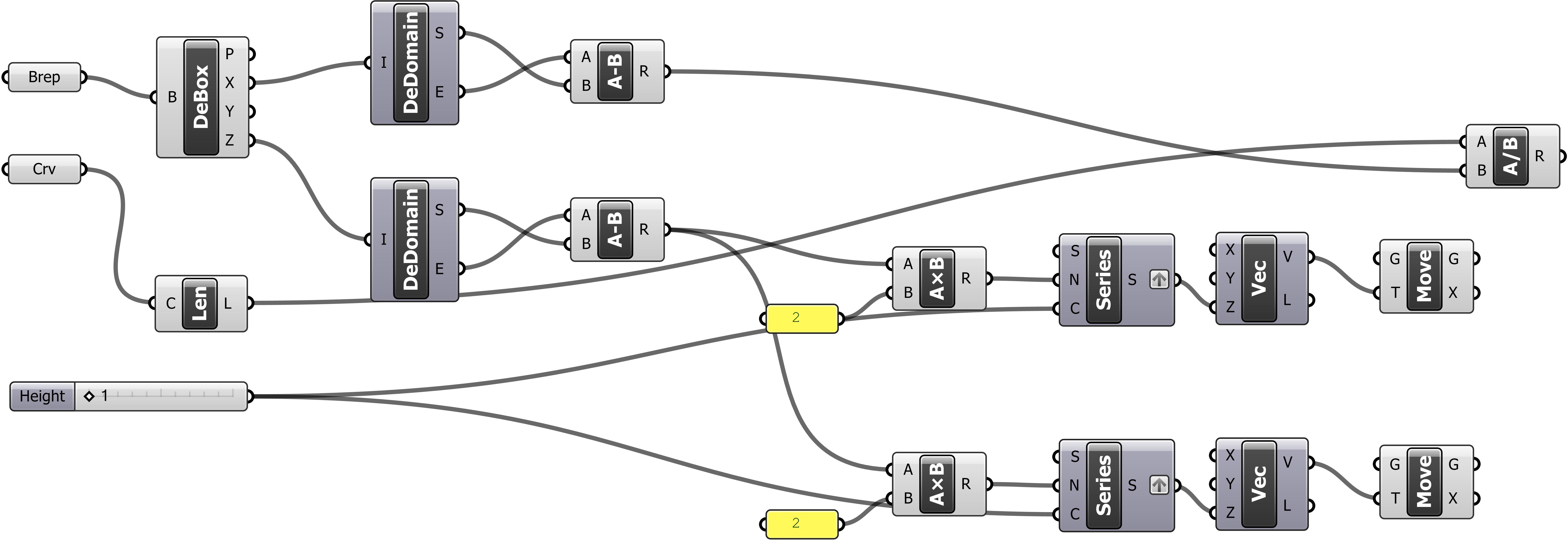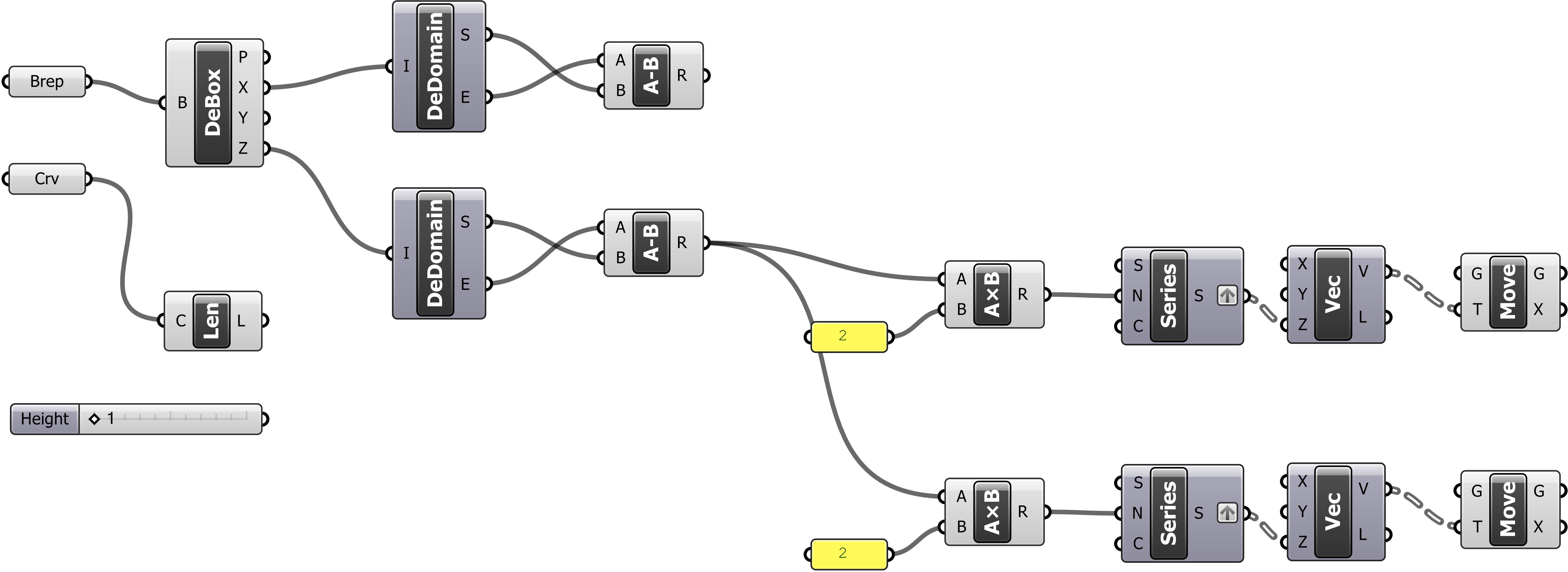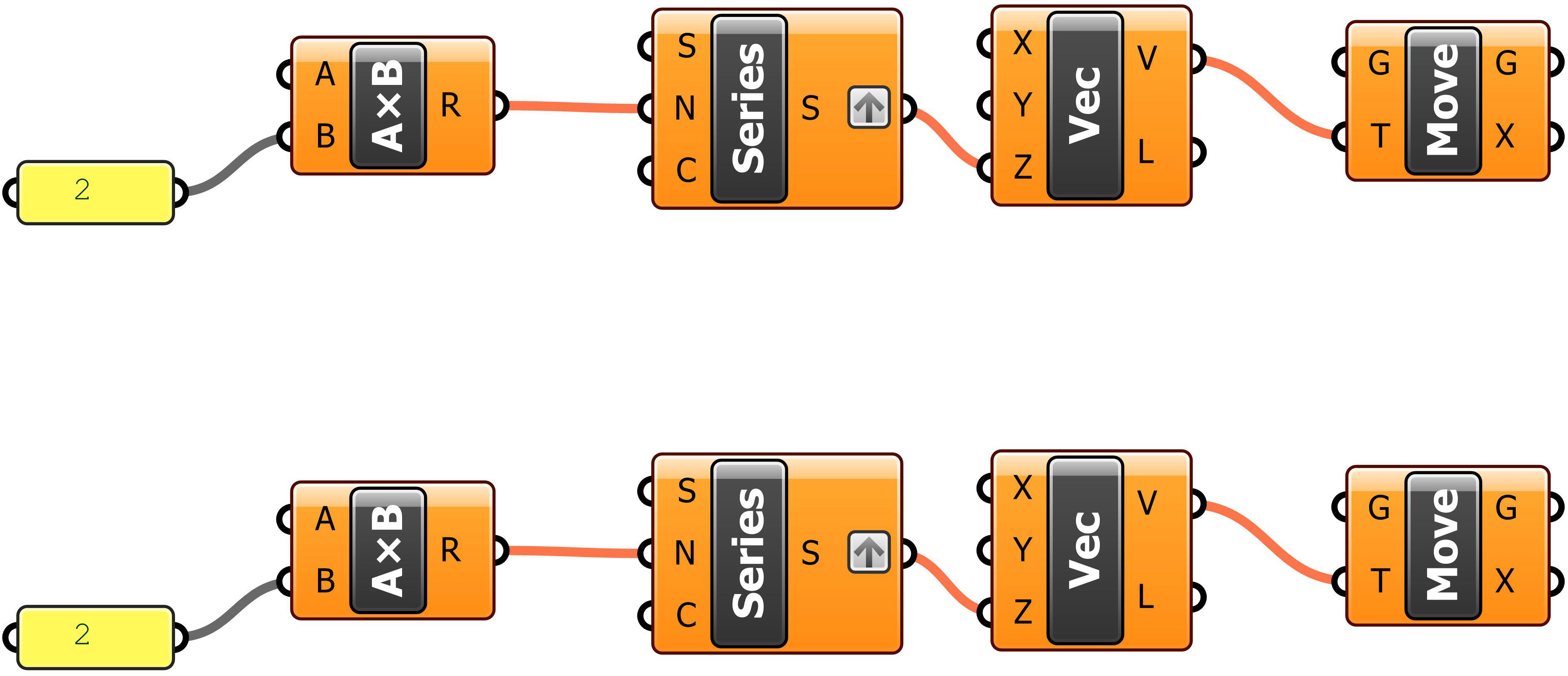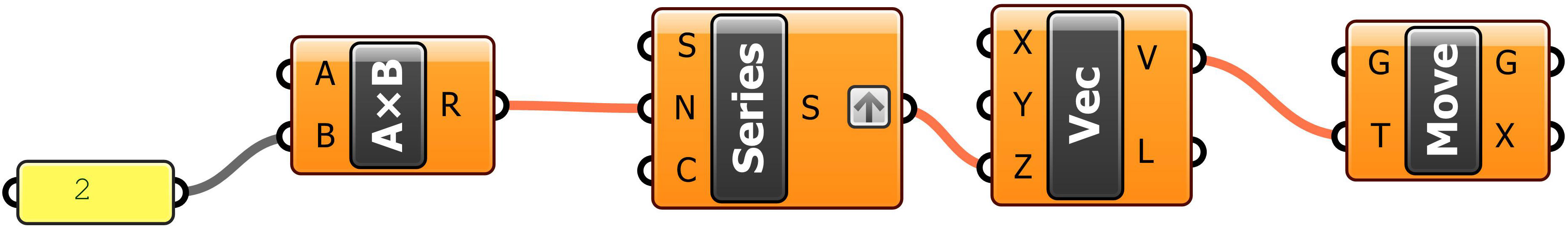 12. Copy-paste this entire group of components (i. e., Panel, Multiplication, Series, Vector XYZ, and Move) and set the new components below the original ones.