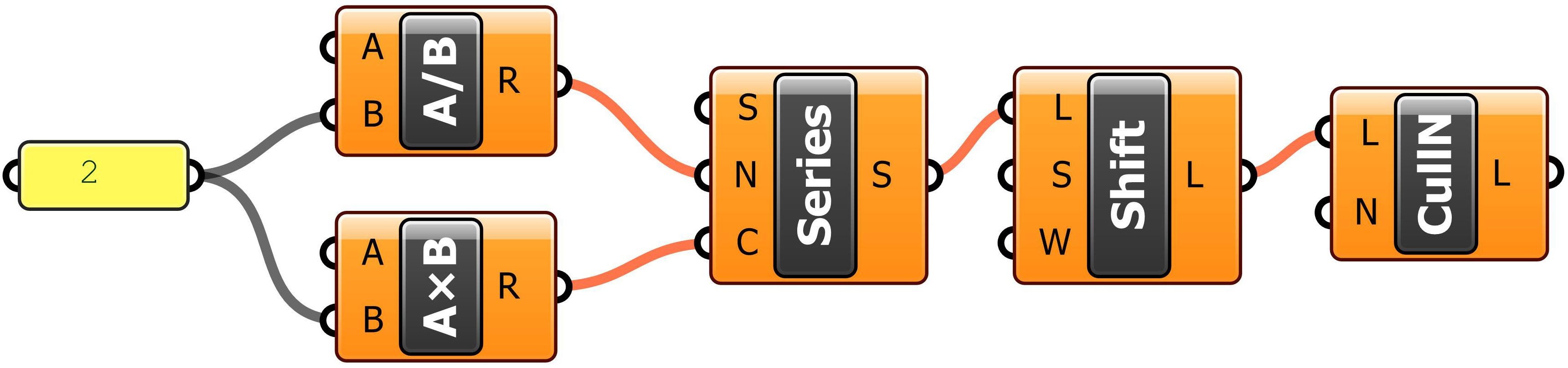 17. Connect the components: Panel output to the B input on the Division and Multiplication components; R output of Division to N input on Series; R output of Multiplication to C input of Series; S output of Series to L input of Shift List; L output of Shift List to L input of Cull Nth.