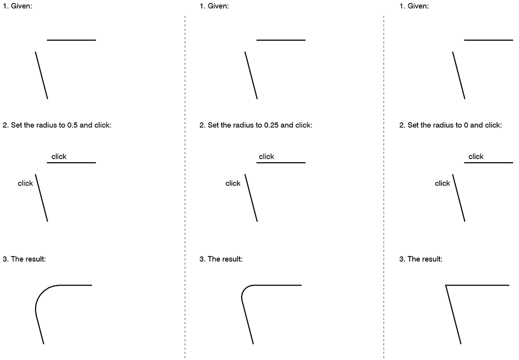 FILLET (F): The FILLET command can be differently understood as a combination of the functions of EXTEND and TRIM, and/or as a means of providing rounded connections between lines. The command always operates on two independent objects. Its operation is constrained by its radius setting. (To change the fillet radius, type FILLET, and then type R for radius.)