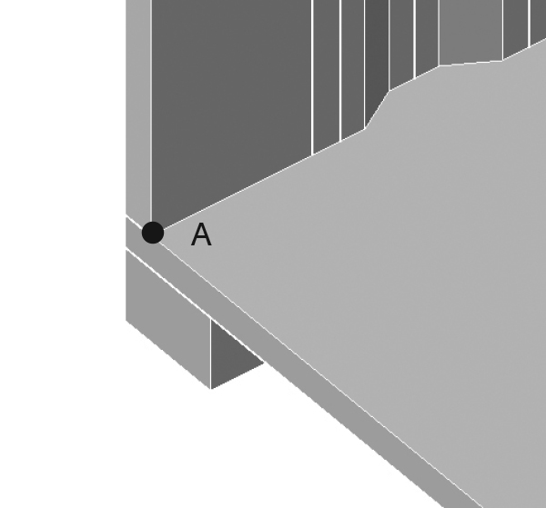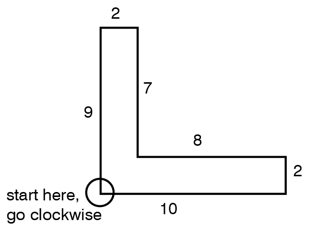 On the Create tab, Forms panel, choose the Extrusion tool. Next, on the Modify | Create Extrusion tab, Draw panel, choose the Line tool. On the Options bar, check “Chain” on. Use the Line tool to draw a figure corresponding with the diagram below, with the outside corner of the “L” at the intersection of the reference lines. On the Modify | Create Extrusion tab, Mode panel, click the green check mark to complete the extrusion.