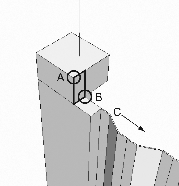 On the Architecture tab, Build Panel, choose the Wall: Architectural tool. On the Options bar, set the Height to Roof. Set the Location Line to Finish Face: Exterior. Check the “Chain” box off. Click on the point marked A in the diagram below to begin placing the wall. Click on point B to complete the wall. Then click on the Modify tool to complete the command. Height is a constraint. Any change to the location of the Roof level will affect the height of the walls constrained to it. (Choosing Unconnected for Height omits the constraint.) See [F1] > Revit Users > Build the Model > Architectural Modeling > Walls > Placing Walls.